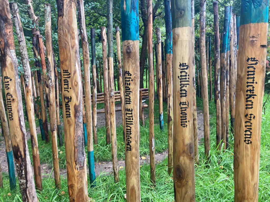 Heksen kijken in Wageningen, het kan nog. Maar niet op gruwelijke manier van vroeger, toen het publiek werd opgetrommeld om aanwezig te zijn bij een test waarin werd bepaald of een mens, meestal een onschuldige vrouw, een heks was of niet – soms met dodelijke afloop. Vaak volgde daarop een openbare bestraffing of executie. Nee, zo doen we dat niet meer, maar als herinnering, en ook als waarschuwing, staat er in het Belmonte Arboretum een rij van 439 palen waarop de namen staan van mensen die in vroeger tijden in de Lage Landen zijn veroordeeld en gestraft wegens zogenaamde hekserij. Dit, omdat ze beschikten over ‘mysterieuze’ kennis van kruiden en planten, en daarom verdacht waren. Het kunstwerk van Femke Herregraven, Aleyda en Entgen genaamd, was in 2024 een van de inzendingen van de internationale tentoonstelling ‘Heksenkruid’, de twaalfde van de ‘Beelden op de Berg’- exposities die sinds 1976 in dit park plaatsvinden. Als enige van alle kunstwerken is ‘Aleyda en Entgen’ nog te zien aan de rand van het park, aan de Rijnkant.